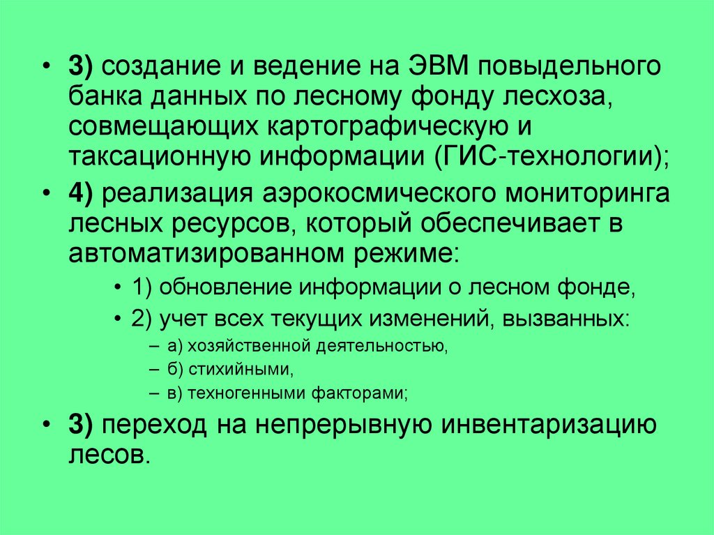 • 3) создание и ведение на ЭВМ повыдельногобанка данных по лесному фонду лесхоза,