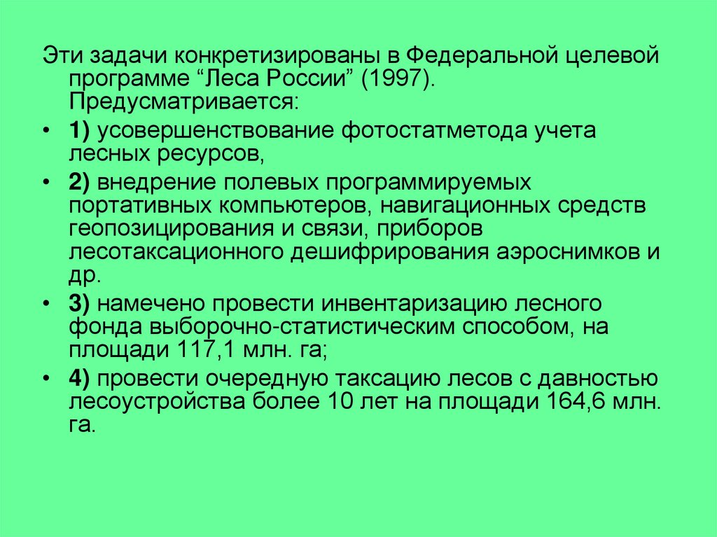 Эти задачи конкретизированы в Федеральной целевойпрограмме “Леса России” (1997).