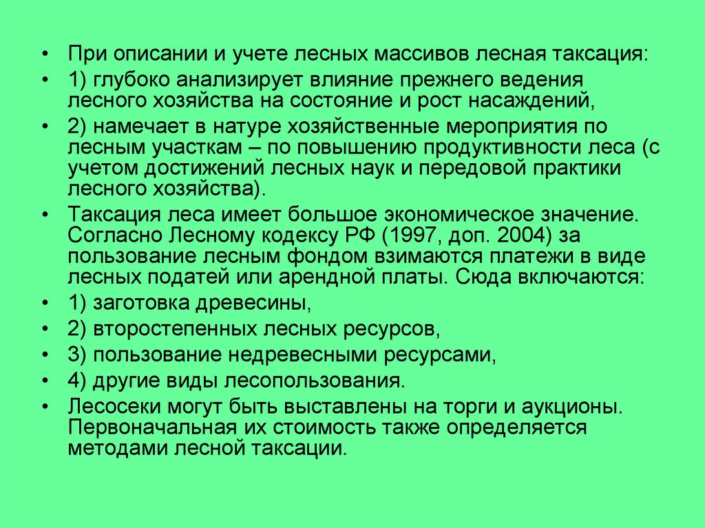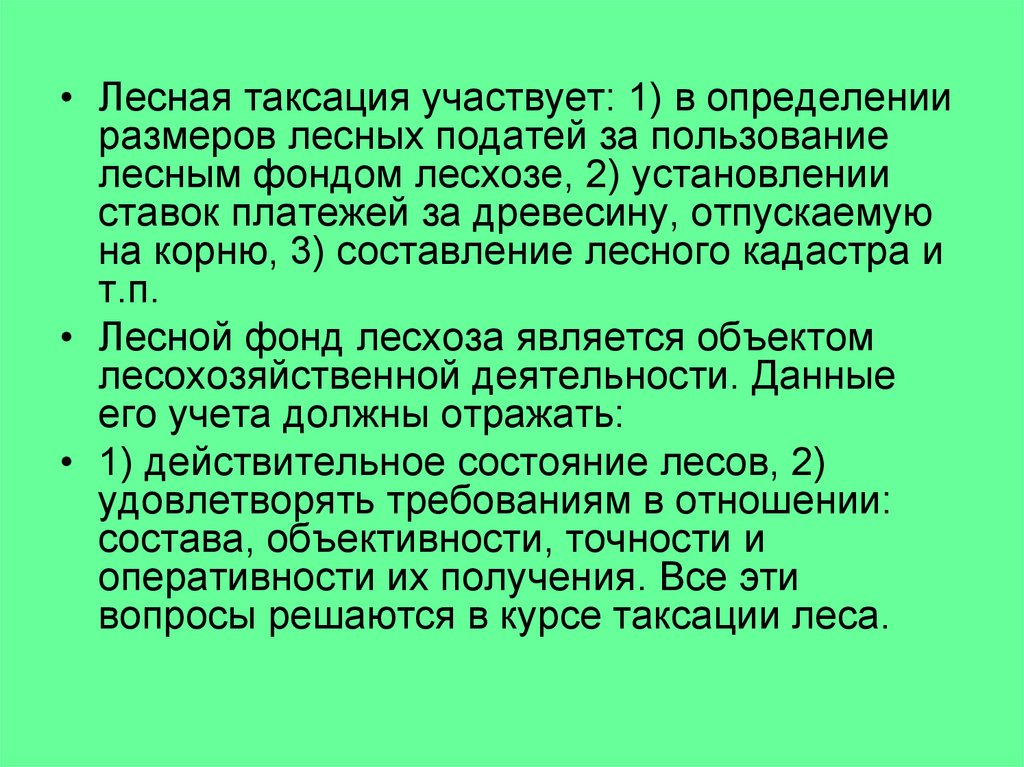 • Лесная таксация участвует: 1) в определенииразмеров лесных податей за пользование
