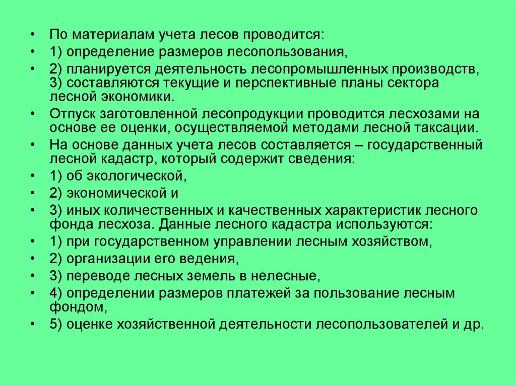 на корню, 3) составление лесного кадастра и