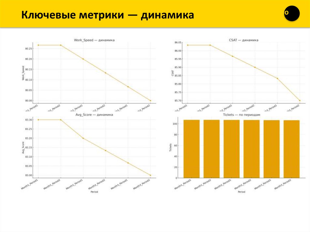 Ключевые метрики: Work_Speed, CSAT, Avg_Score, Tickets — динамика