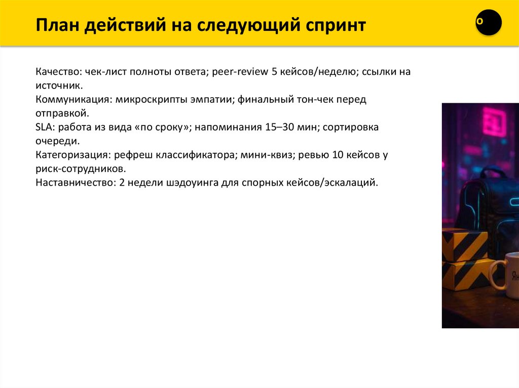 План действий на следующий спринтКачество: чек-лист полноты ответа; peer-review 5 кейсов/неделю; ссылки на