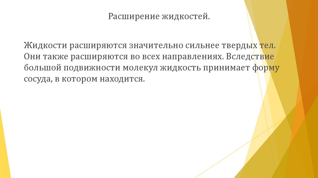 Расширение жидкостей.Жидкости расширяются значительно сильнее твердых тел.