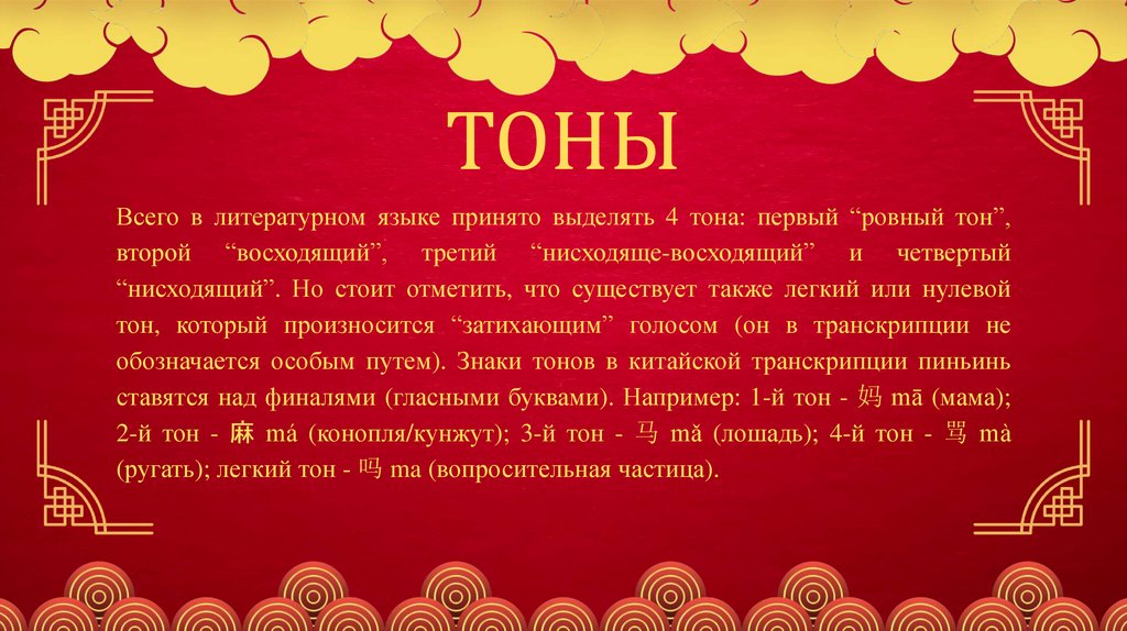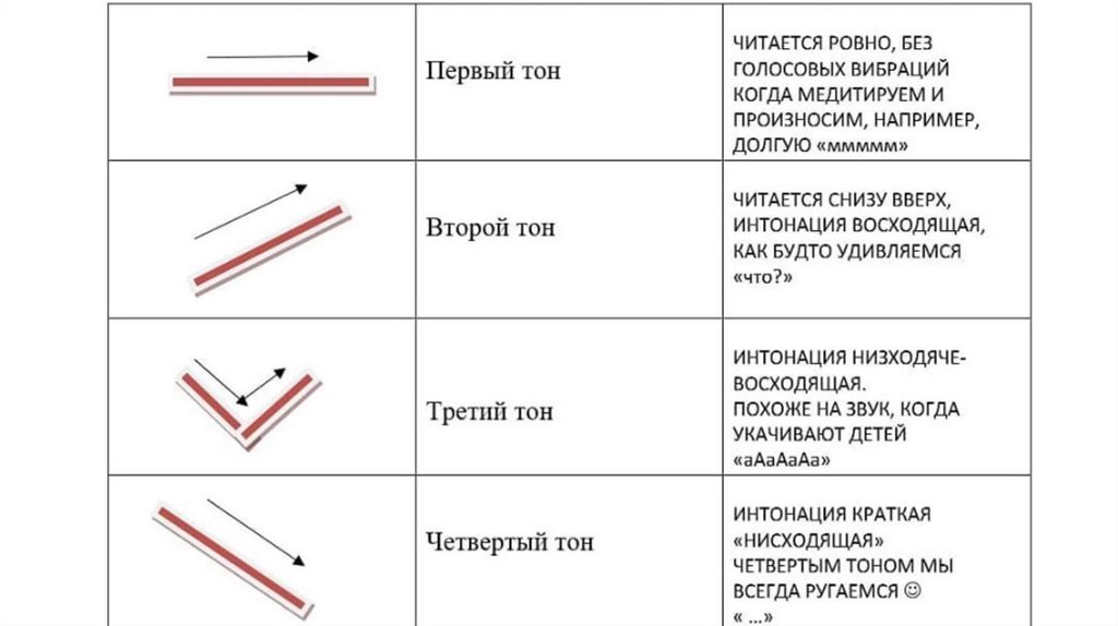 ТОНЫВсего в литературном языке принято выделять 4 тона: первый “ровный тон”,