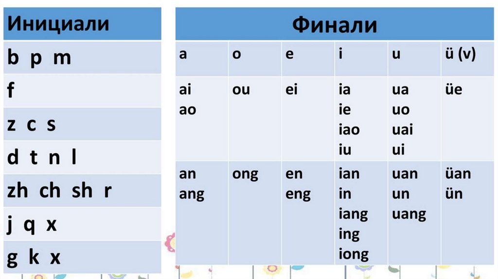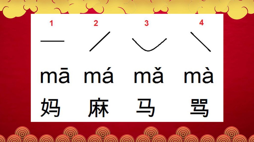 ставятся над финалями (гласными буквами). Например: 1-й тон - 妈 mā (мама);