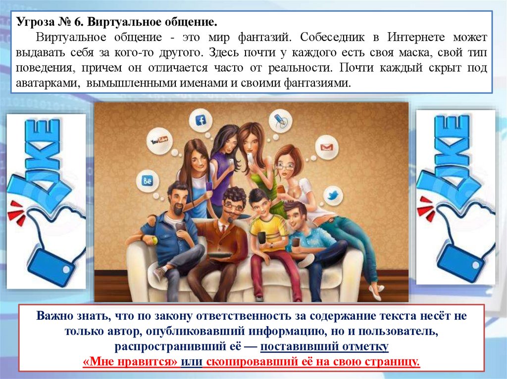Угроза № 6. Виртуальное общение.Виртуальное общение - это мир фантазий. Собеседник в Интернете может