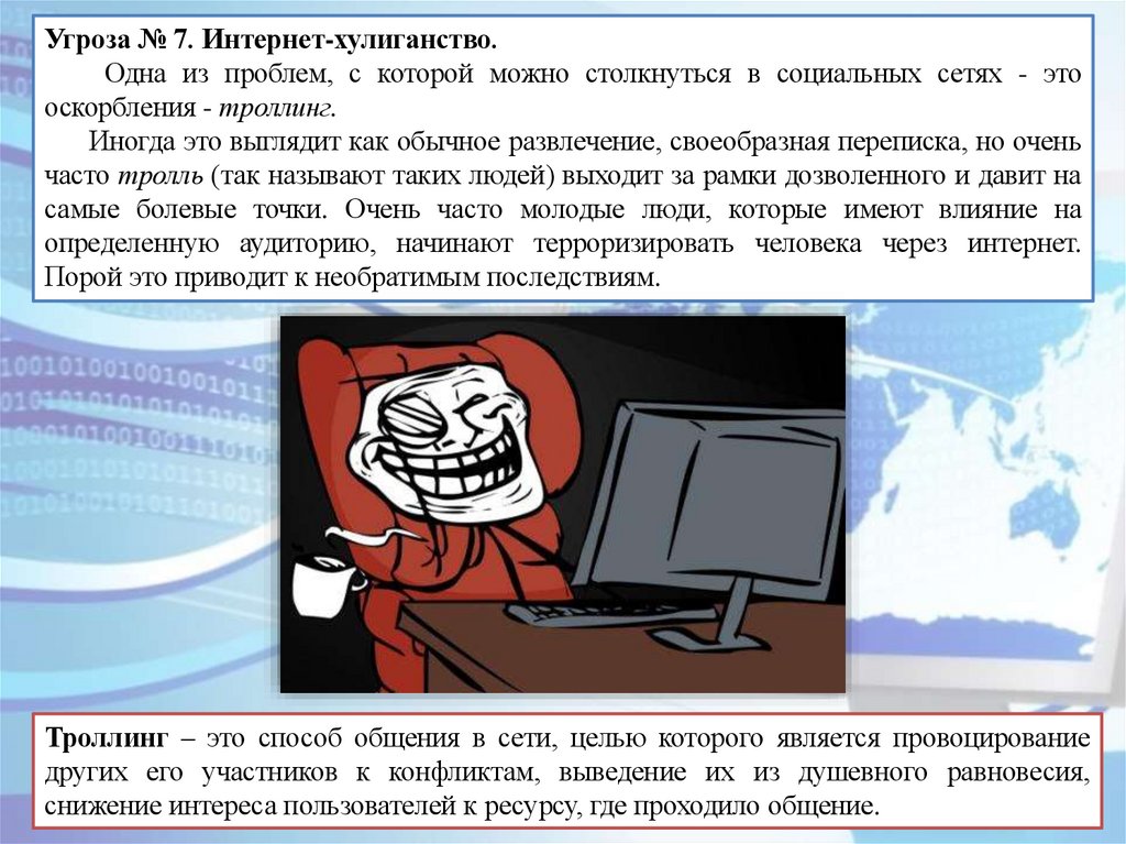 Угроза № 7. Интернет-хулиганство.Одна из проблем, с которой можно столкнуться в социальных сетях - это