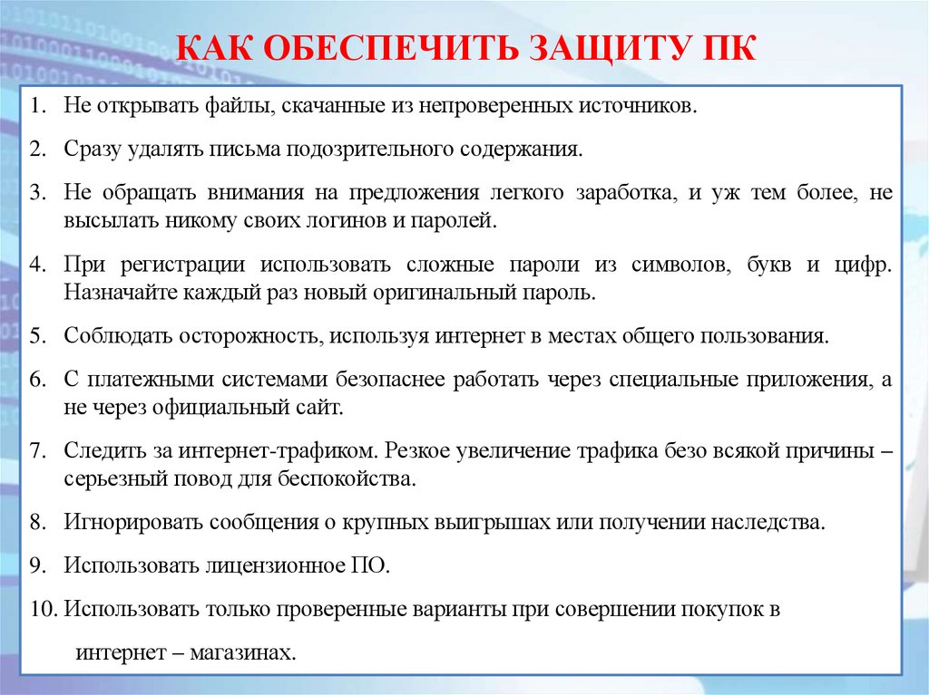 КАК ОБЕСПЕЧИТЬ ЗАЩИТУ ПК1. Не открывать файлы, скачанные из непроверенных источников.