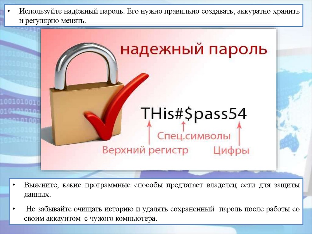 Используйте надёжный пароль. Его нужно правильно создавать, аккуратно хранить