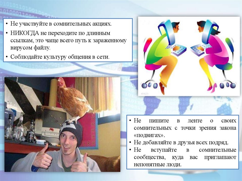 • Не участвуйте в сомнительных акциях.• НИКОГДА не переходите по длинным