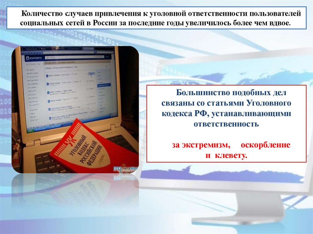 Количество случаев привлечения к уголовной ответственности пользователейсоциальных сетей в России за последние годы увеличилось более чем вдвое.