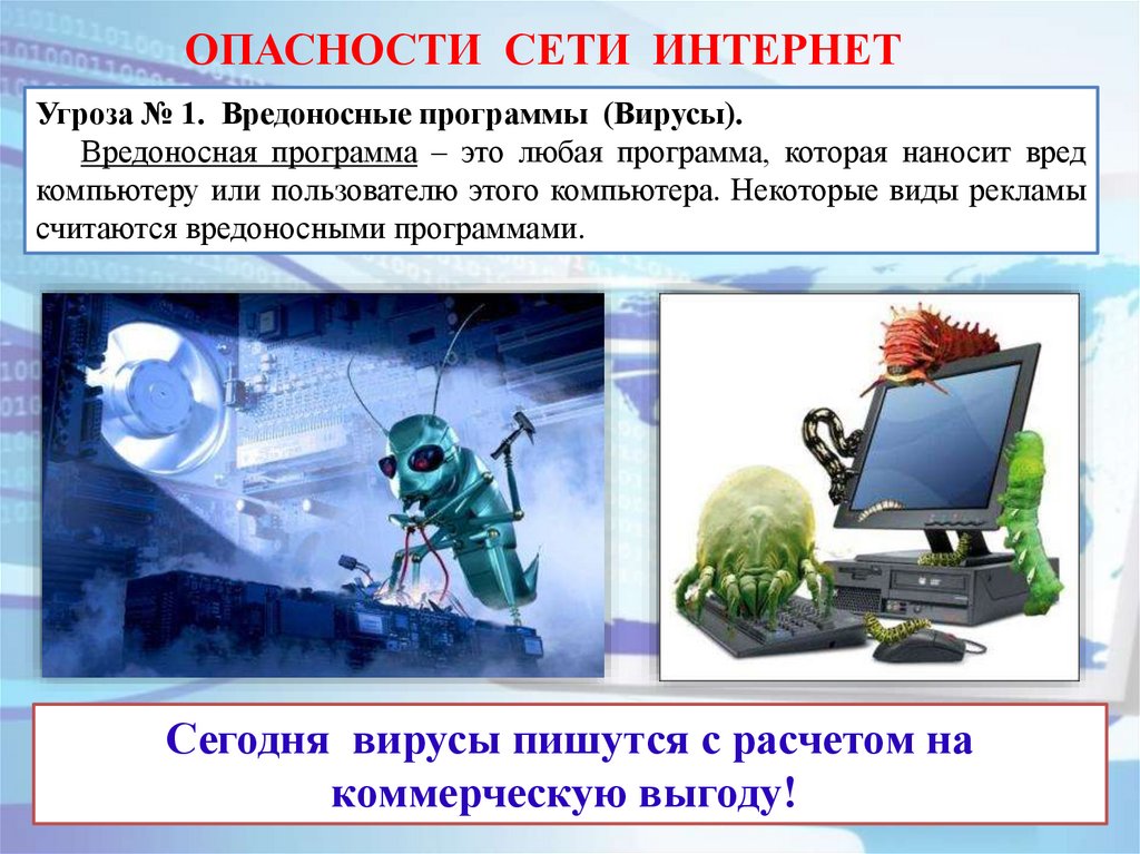 ОПАСНОСТИ СЕТИ ИНТЕРНЕТУгроза № 1. Вредоносные программы (Вирусы).