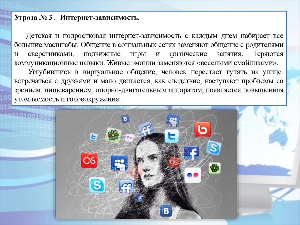 Угроза № 3 . Интернет-зависимость.Детская и подростковая интернет-зависимость с каждым днем набирает все