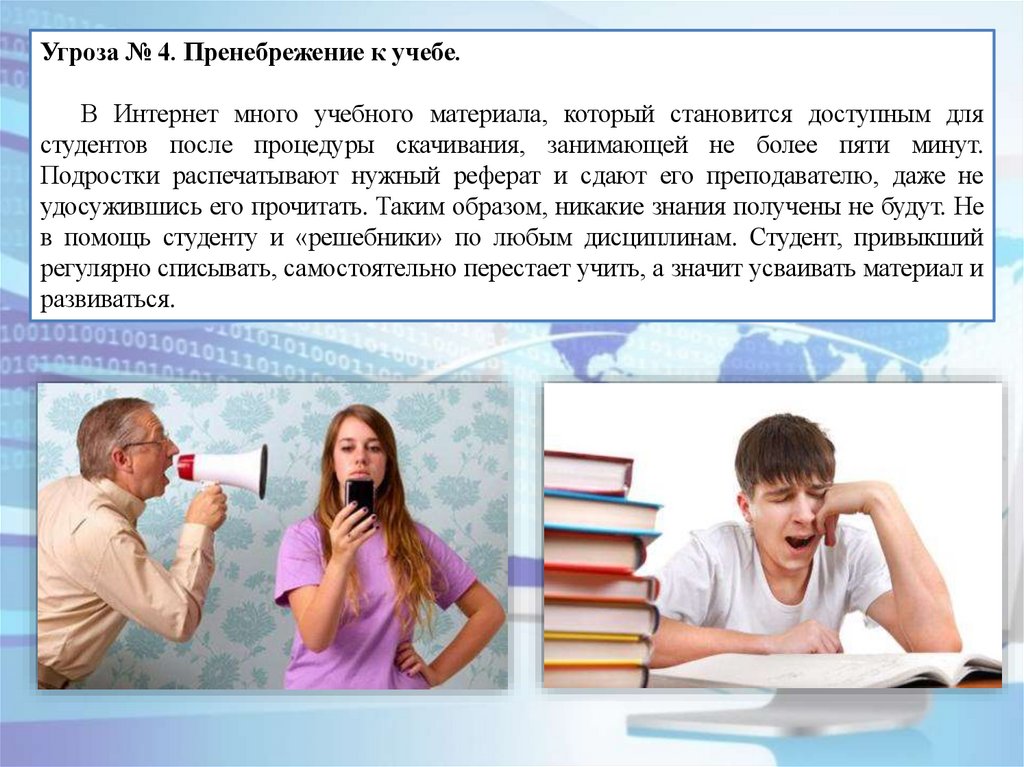 Угроза № 4. Пренебрежение к учебе.В Интернет много учебного материала, который становится доступным для