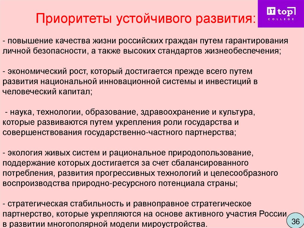 Приоритеты устойчивого развития:- повышение качества жизни российских граждан путем гарантирования
