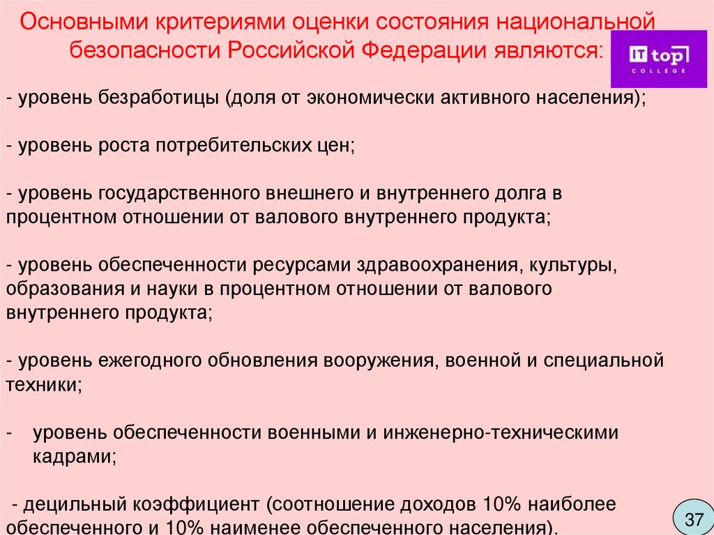 Основными критериями оценки состояния национальнойбезопасности Российской Федерации являются: