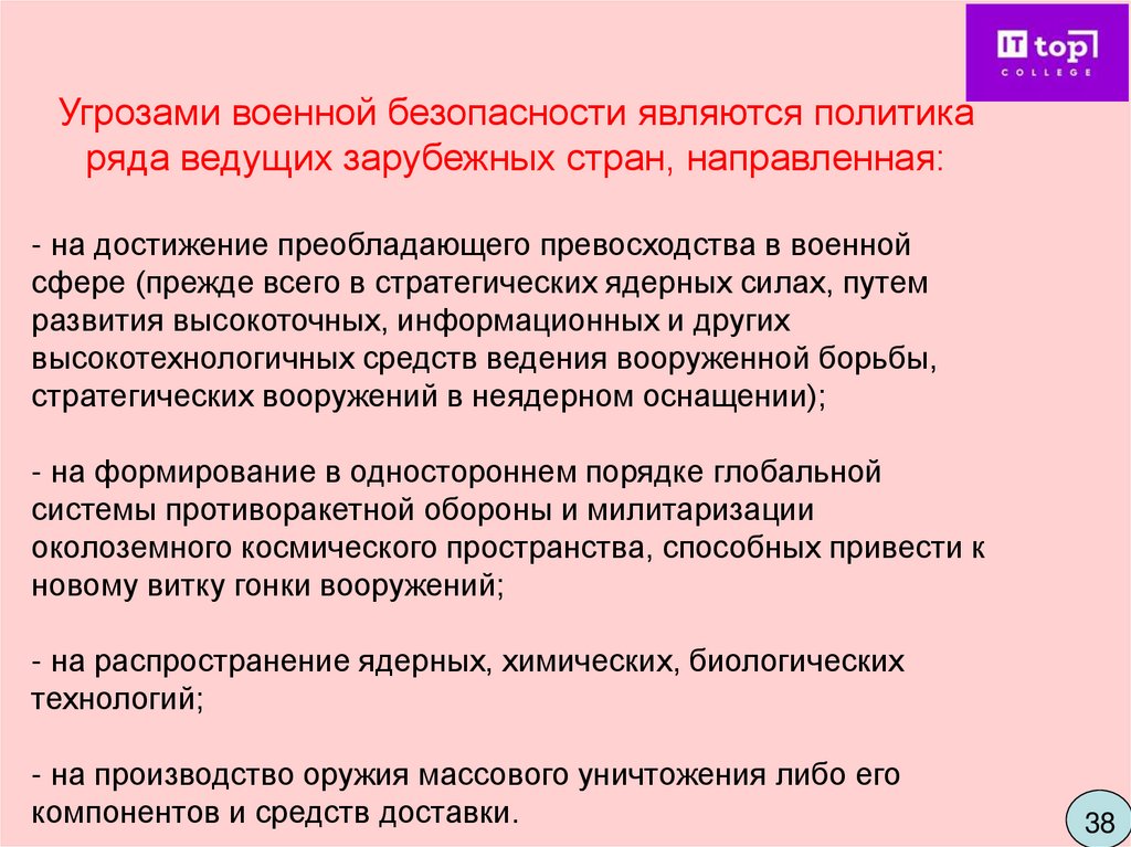 Угрозами военной безопасности являются политикаряда ведущих зарубежных стран, направленная:
