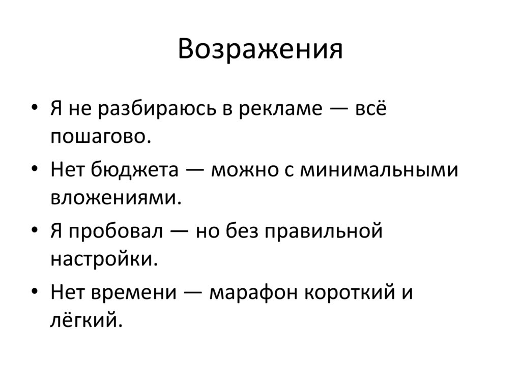 Возражения• Я не разбираюсь в рекламе — всё