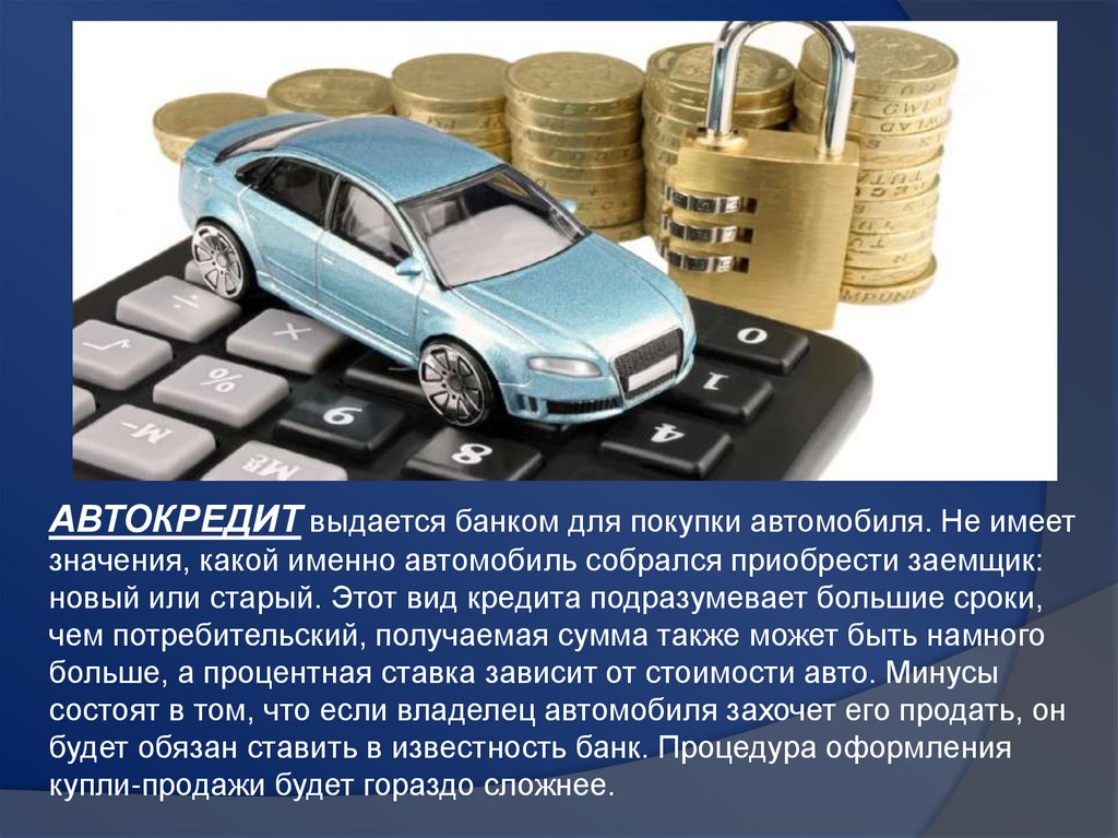 АВТОКРЕДИТ выдается банком для покупки автомобиля. Не имеетзначения, какой именно автомобиль собрался приобрести заемщик: