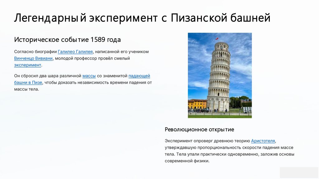 Легендарны й эксперимент с Пизанской башнейИсторическое собы тие 1 589 года