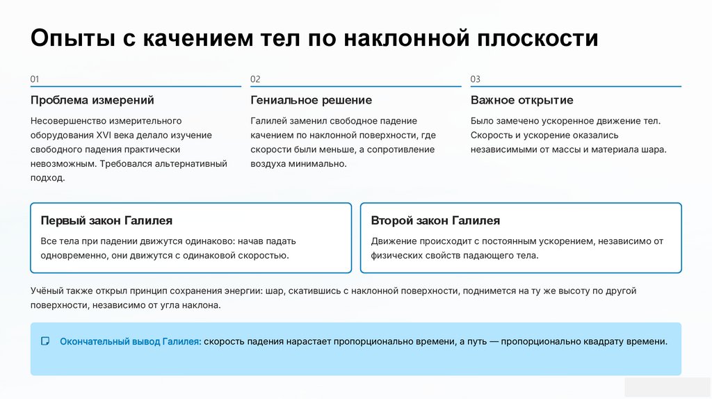 Окончательный вывод Галилея: скорость падения нарастает пропорционально времени, а путь — пропорционально квадрату времени.