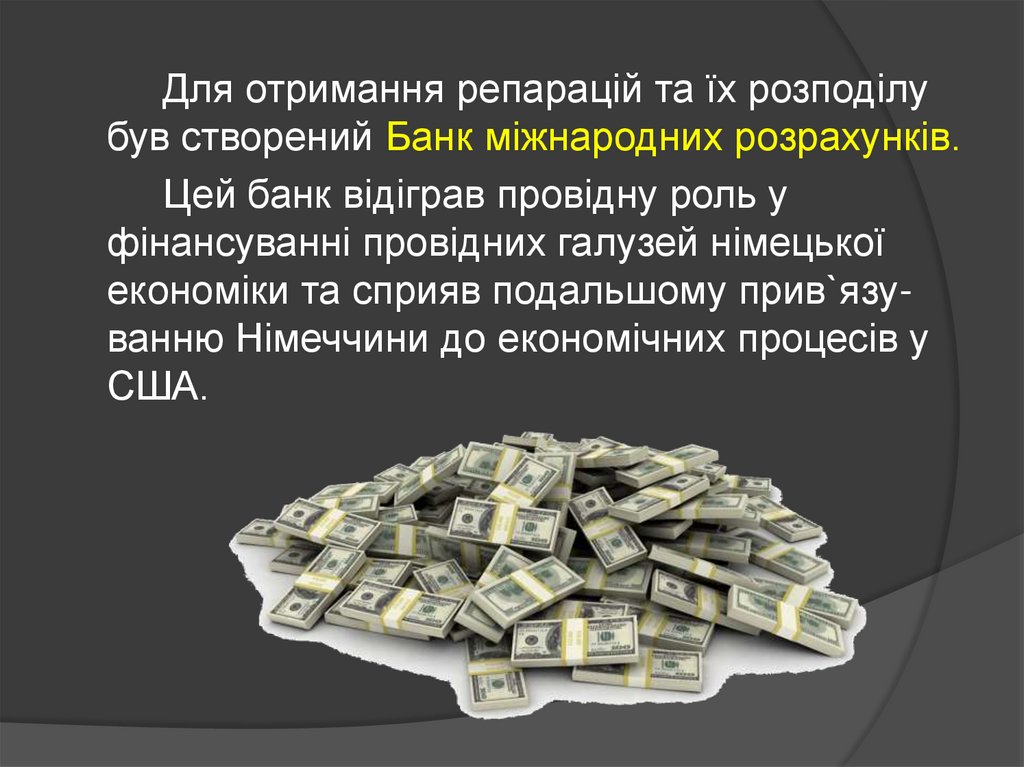 Для отримання репарацій та їх розподілубув створений Банк міжнародних розрахунків.