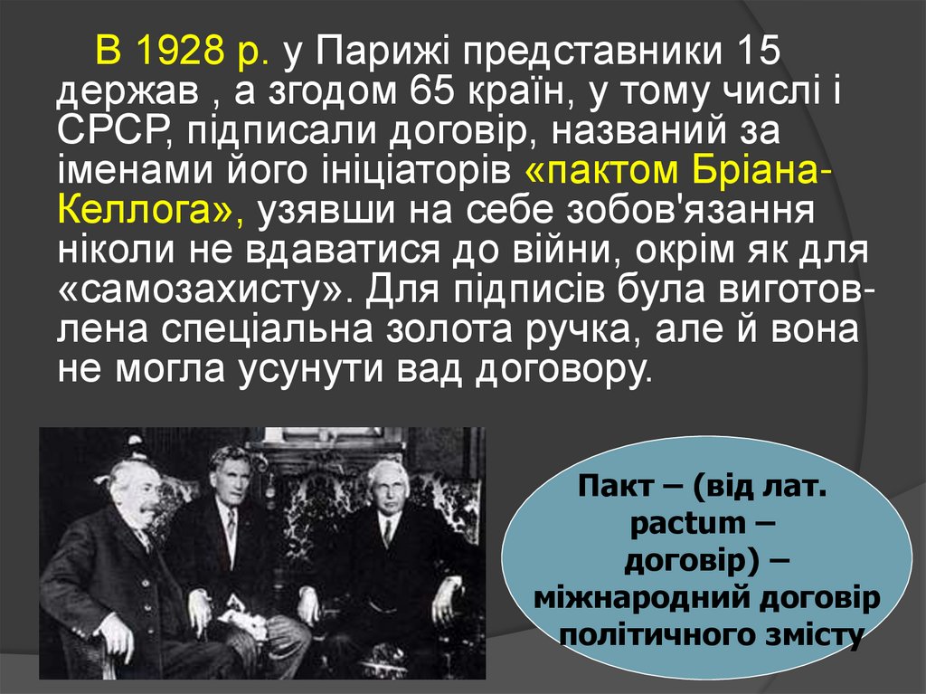 В 1928 р. у Парижі представники 15держав , а згодом 65 країн, у тому числі і