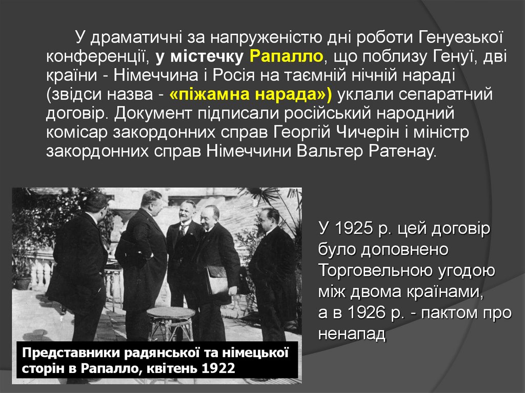 У драматичні за напруженістю дні роботи Генуезькоїконференції, у містечку Рапалло, що поблизу Генуї, дві