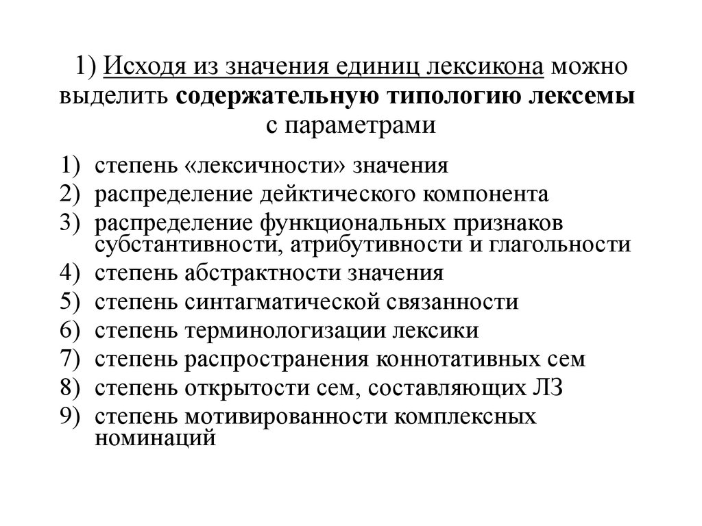 1) Исходя из значения единиц лексикона можновыделить содержательную типологию лексемы