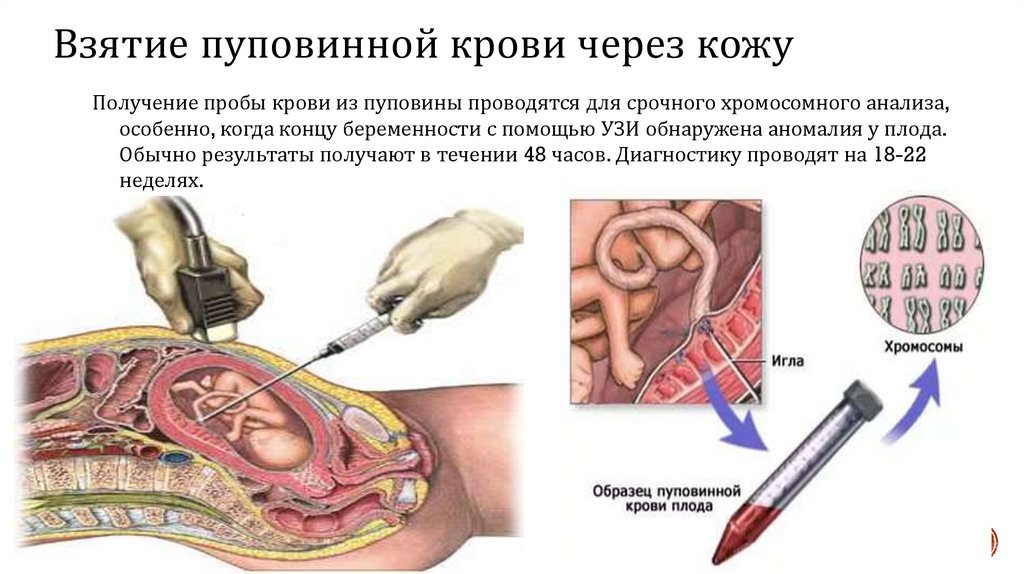 Взятие пуповинной крови через кожуПолучение пробы крови из пуповины проводятся для срочного хромосомного анализа,