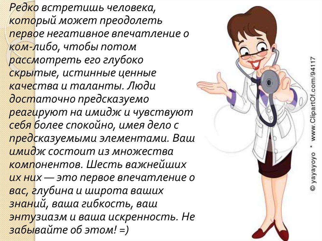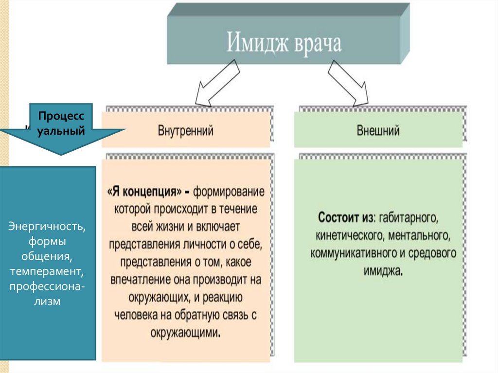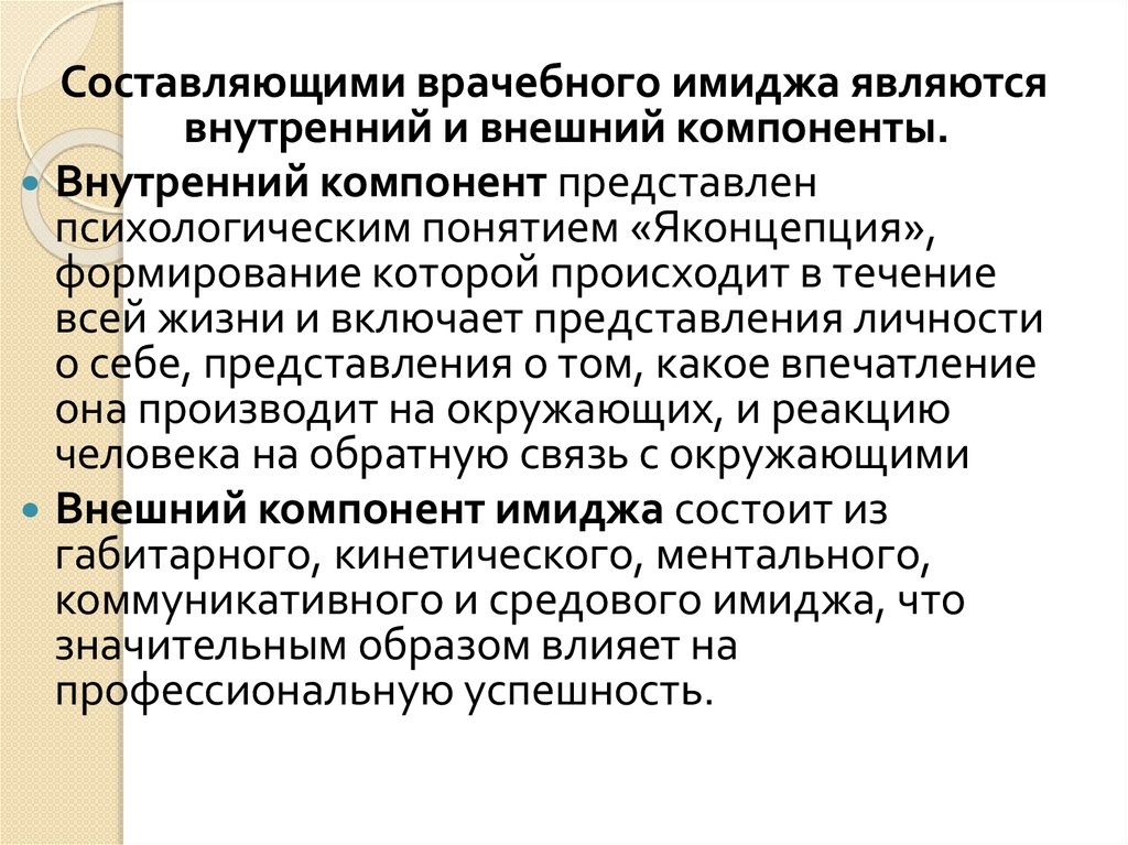 Составляющими врачебного имиджа являютсявнутренний и внешний компоненты.