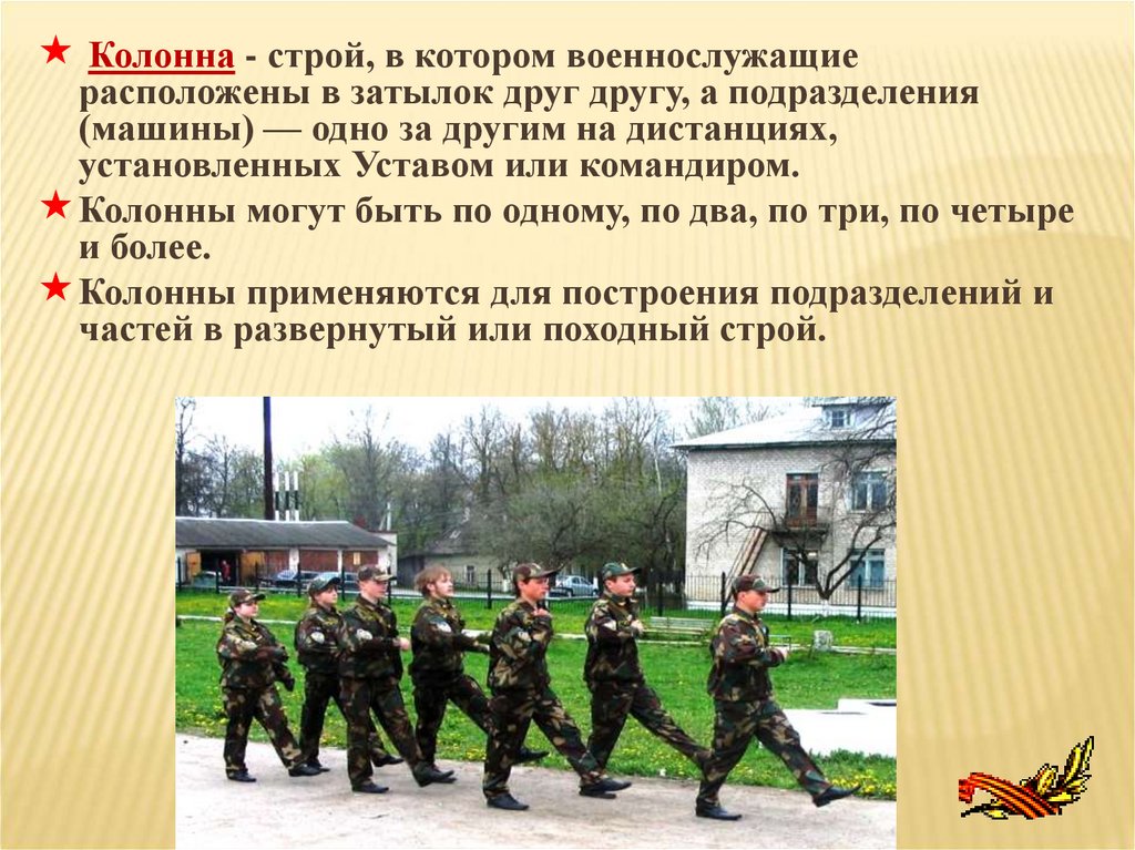 Колонна - строй, в котором военнослужащиерасположены в затылок друг другу, а подразделения