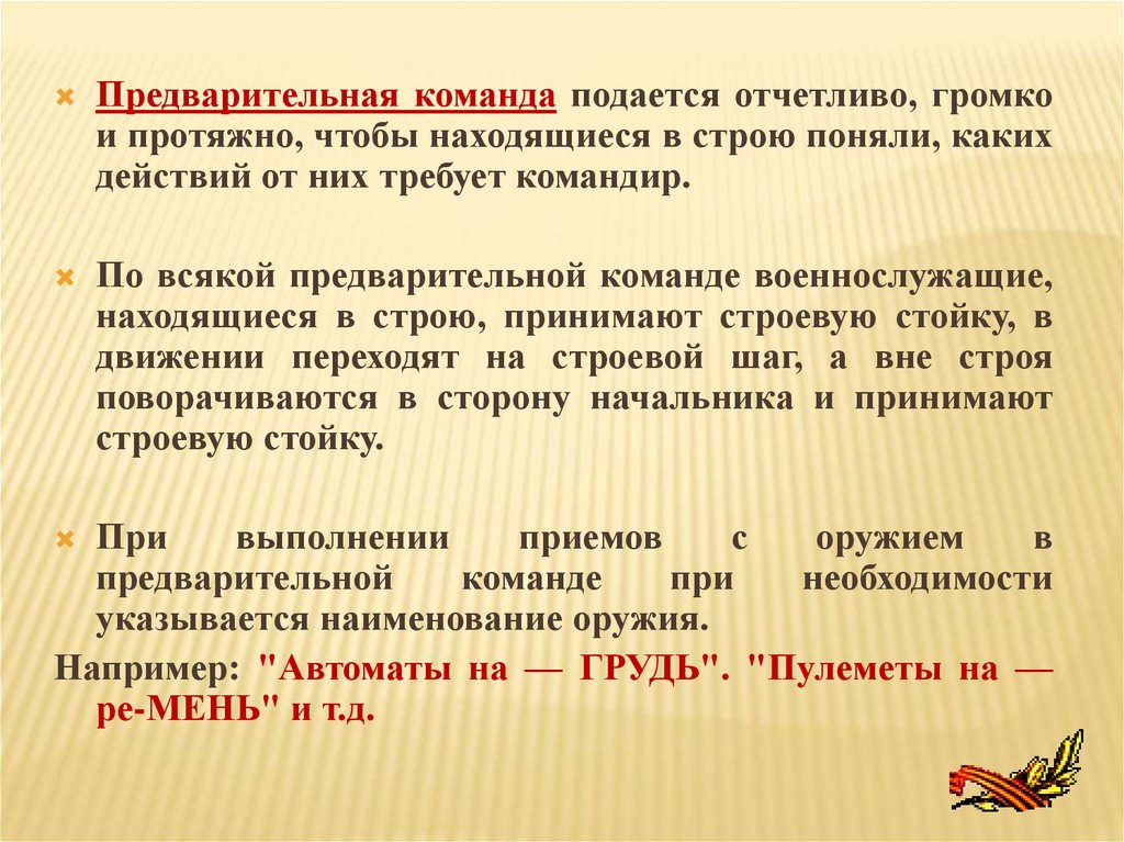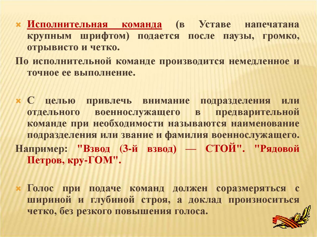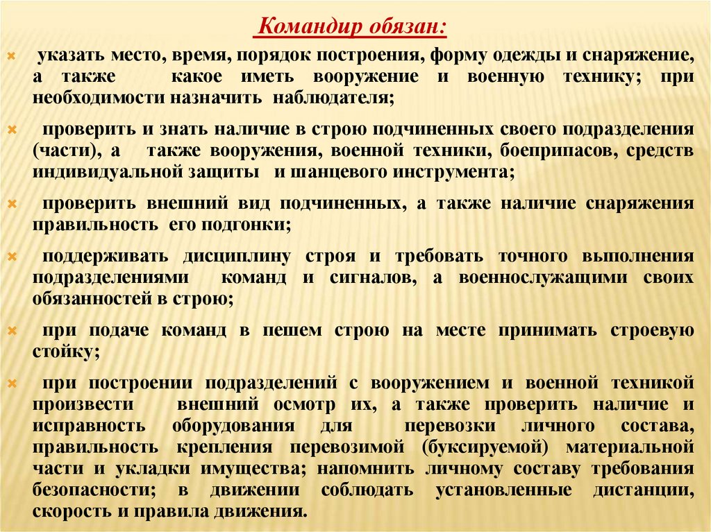 Командир обязан:указать место, время, порядок построения, форму одежды и снаряжение,