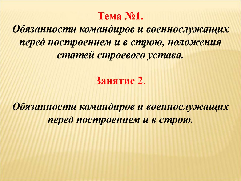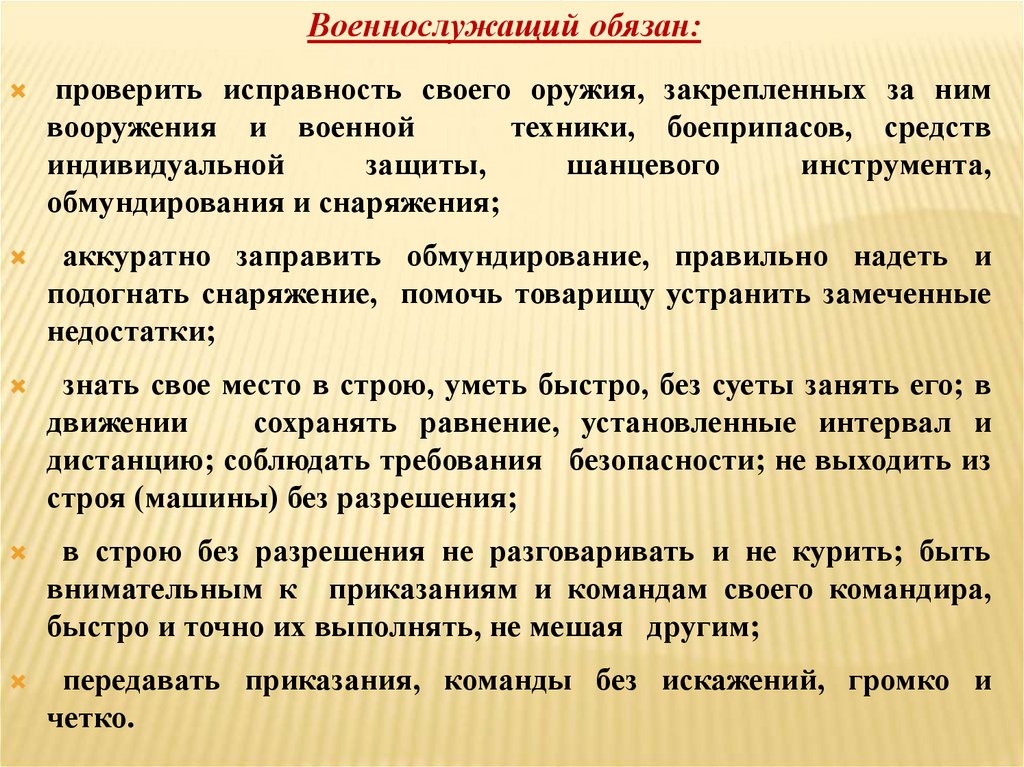 Изучить и быть в готовности доложить:1-24 статьи строевого устав ВС РФ;