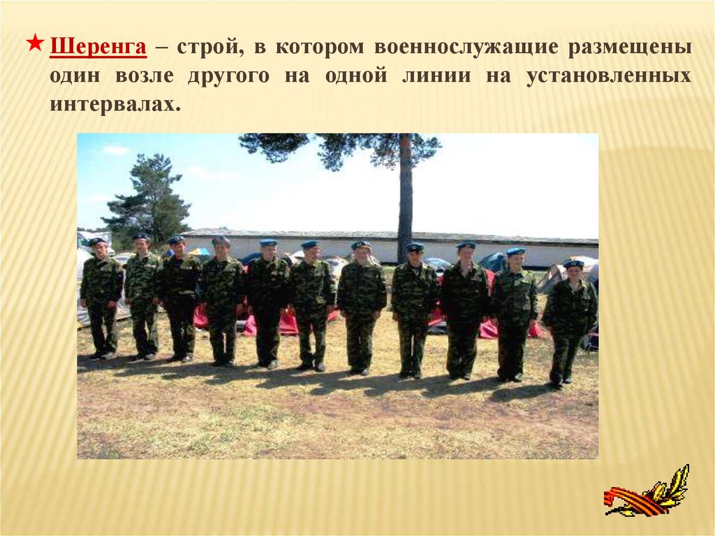 Шеренга – строй, в котором военнослужащие размещеныодин возле другого на одной линии на установленных