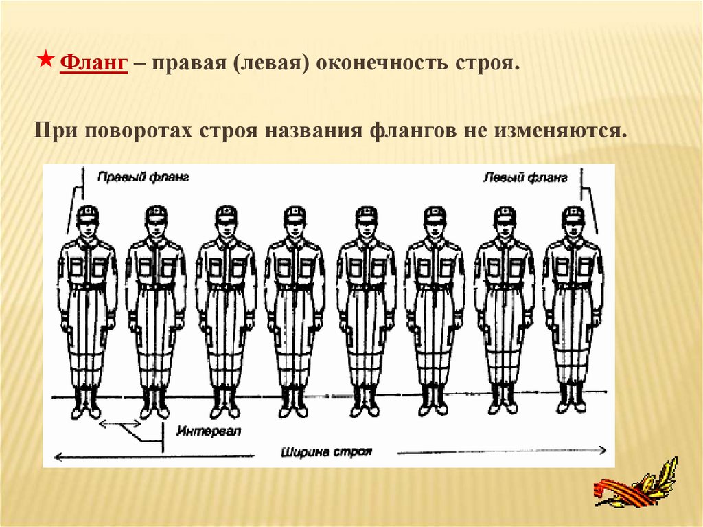 Фланг – правая (левая) оконечность строя.При поворотах строя названия флангов не изменяются.