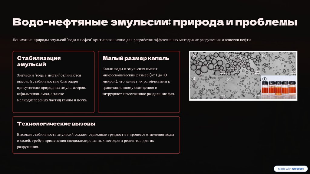 Водо-нефтяные эмульсии: природа и проблемыПонимание природы эмульсий "вода в нефти" критически важно для разработки эффективных методов их разрушения и очистки нефти.