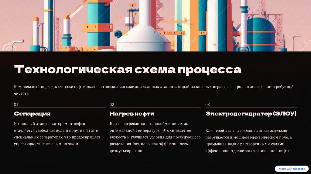 Технологическая схема процессаКомплексный подход к очистке нефти включает несколько взаимосвязанных этапов, каждый из которых играет свою роль в достижении требуемой