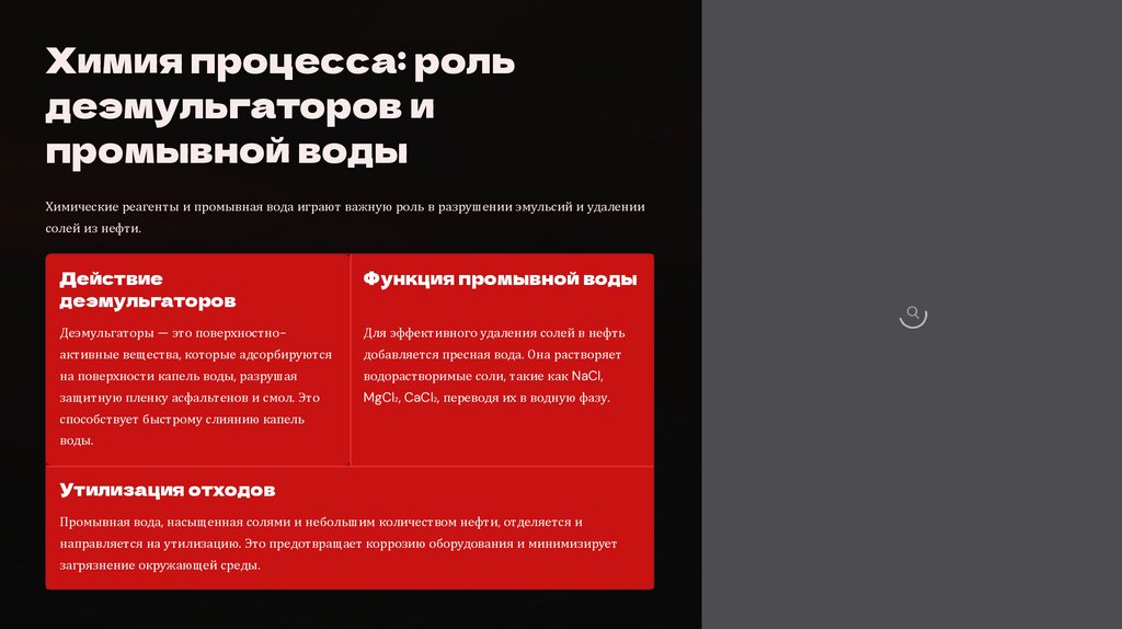 Химические реагенты и промывная вода играют важную роль в разрушении эмульсий и удалении