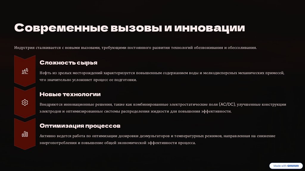 Современные вызовы и инновацииИндустрия сталкивается с новыми вызовами, требующими постоянного развития технологий обезвоживания и обессоливания.