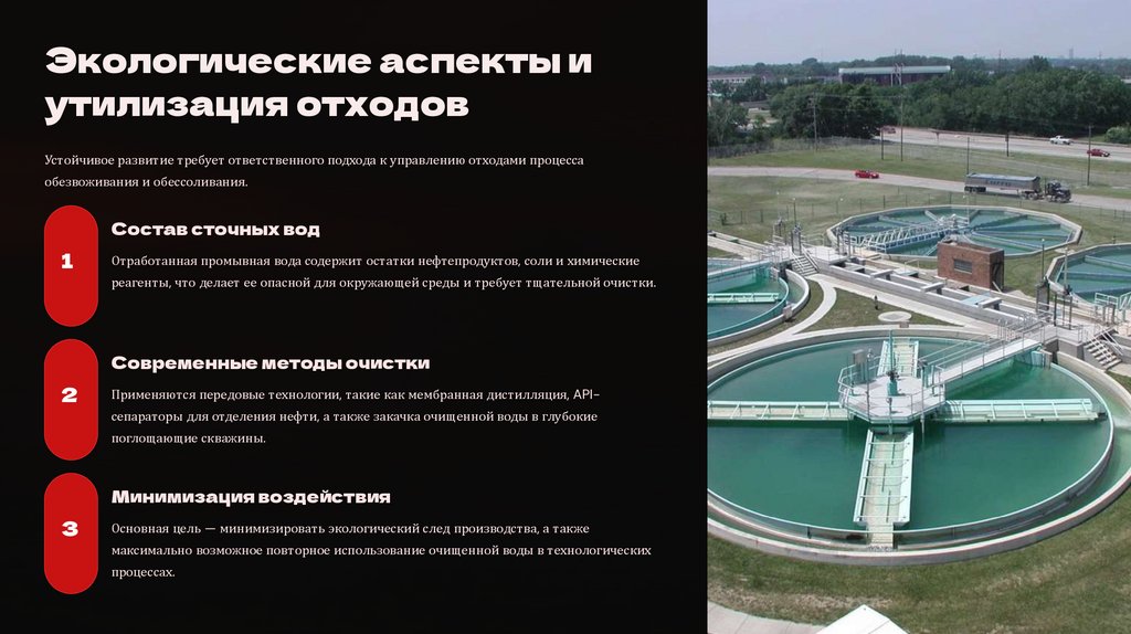 Применяются передовые технологии, такие как мембранная дистилляция, APIсепараторы для отделения нефти, а также закачка очищенной воды в глубокие