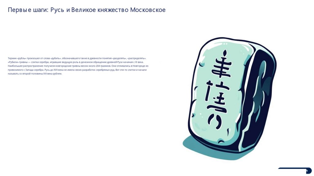Первы е шаги: Р усь и Вел икое княжество МосковскоеТермин «рубль» произошел от слова «рубить», обозначавшего также в древности понятия «разделять», «распределять».
