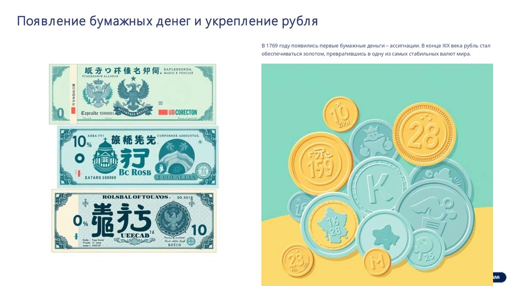 Появление бумажны х денег и укрепление рубл яВ 1769 году появились первые бумажные деньги – ассигнации. В конце XIX века рубль стал