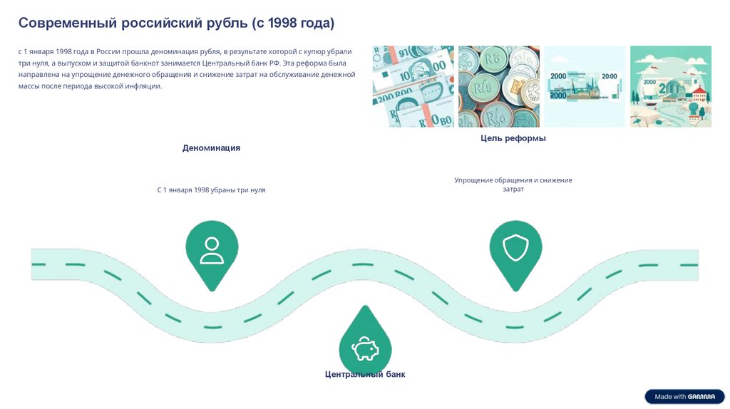 Современный российский рубль (с 1998 года)с 1 января 1998 года в России прошла деноминация рубля, в результате которой с купюр убрали