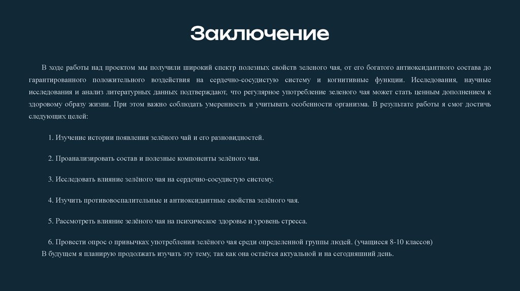 ЗаключениеВ ходе работы над проектом мы получили широкий спектр полезных свойств зеленого чая, от его богатого антиоксидантного состава до