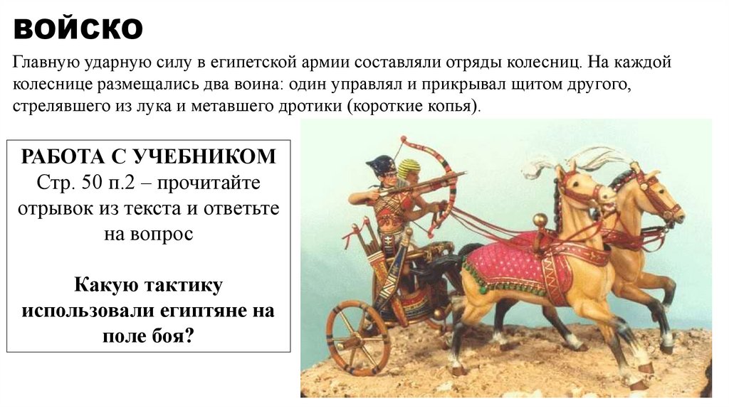 ВОЙСКОГлавную ударную силу в египетской армии составляли отряды колесниц. На каждой