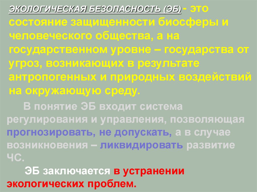 ЭКОЛОГИЧЕСКАЯ БЕЗОПАСНОСТЬ (ЭБ) - этосостояние защищенности биосферы и