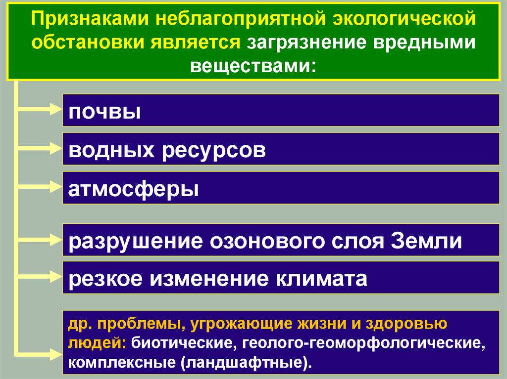 Признаками неблагоприятной экологическойобстановки является загрязнение вредными