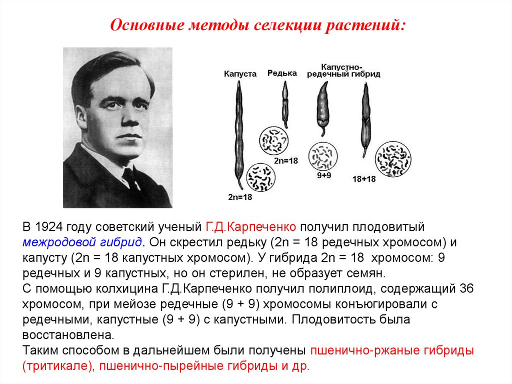 Основные методы селекции растений:В 1924 году советский ученый Г.Д.Карпеченко получил плодовитый