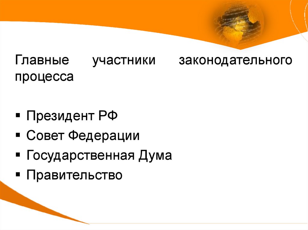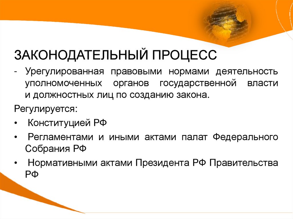ЗАКОНОДАТЕЛЬНЫЙ ПРОЦЕСС- Урегулированная правовыми нормами деятельность